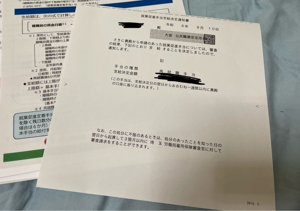 その日、家に帰ったら支払い通知書(再就職手当支給決定通知書)もポストに入っていた。