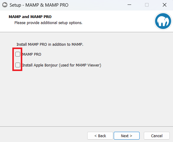 有料版である「MAMP PRO」と「Install app Bonjour(used for MAMP viewer)」のチェックを必ず外す!