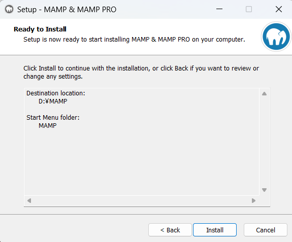 MAMPをインストールする場所やフォルダを確認し、下部の「Install」をクリック。