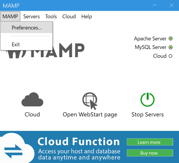 上部メニューにあるMAMP→設定(PREFERENCE)とクリック