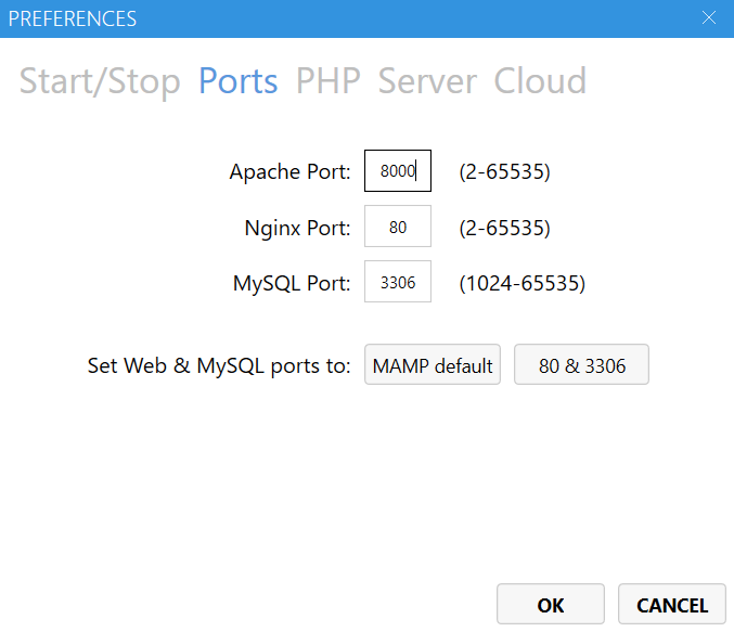 そんなときは、ヘッダーメニューから、MAMP→設定(PREFERENCE)→Portsを開いて、Apach Portを8000に修正。