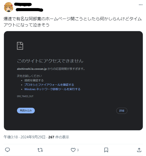 上で阿部寛のホームページが爆速で繋がると説明したばかりだけど、たまにSNSなどで阿部寛のホームページが重くなって繋がらない、という書き込みを見かけることが増えた。